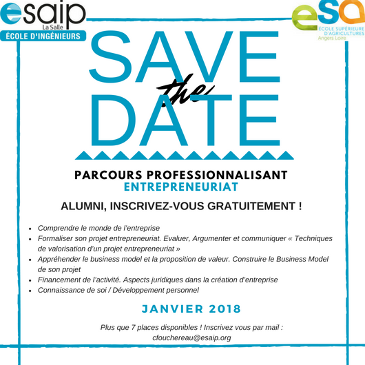 Suite à la mise en ligne de la plateforme du réseau des Alumni, l'ESAIP vous propose de vous inscrire gracieusement à un parcours professionnalisant sur l'entrepreneuriat. Co-organisé avec l'ESA (Ecole Supérieur d'Agricultures), ce parcours professionnalisant s'inscrit dans le cadre des services à haute valeur ajoutée que vous offre l'ESAIP.