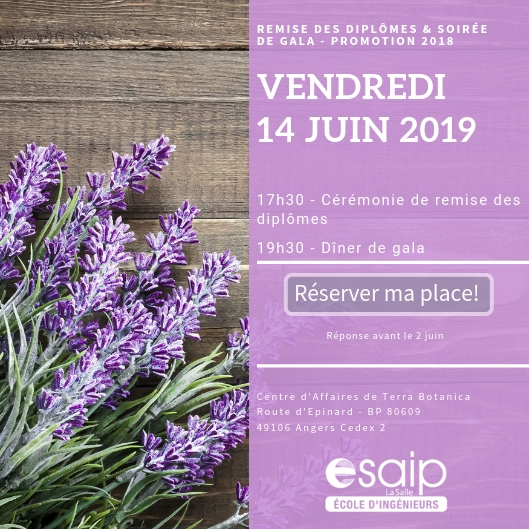 REMISE DES DIPLÔMES ET GALA DE L’ESAIPVendredi 14 juin 2019 – Terra Botanica, AngersRéserver ma placeDiplômés, anciens, étudiants, partenaires, institutionnels… N’attendez plus et réservez dès maintenant votre place pour le Gala de l’ESAIP ! Une belle soirée dans un cadre unique ! Cette soirée est le moment de tous se retrouver dans une ambiance conviviale et festive !17h30 : Cérémonie de remise des diplômes de la promo 2018 – Tous les étudiants de la promo et familles sont conviés19h30 : Gala de l’ESAIP – Dîner, animations, bar à cocktails, espace photos, piste dansante, DJ… (40€)Réserver ma place (réponse avant le 2 juin)